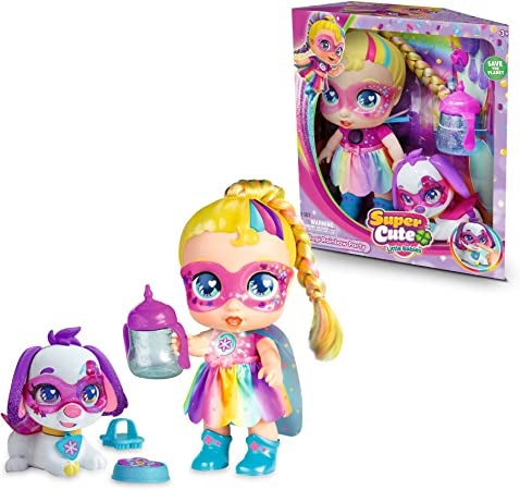 Ecost prekė po grąžinimo, SUPER CUTE LITTLE BABIES - Vaivorykštės vakarėlio lėlė su Regi, superherojus su spalvotais plaukais ir baltu gyvūnėliu sniego gniūžte, dvipusė patalynė ir aksesuarų buteliukas, garsus (UPU06100)
